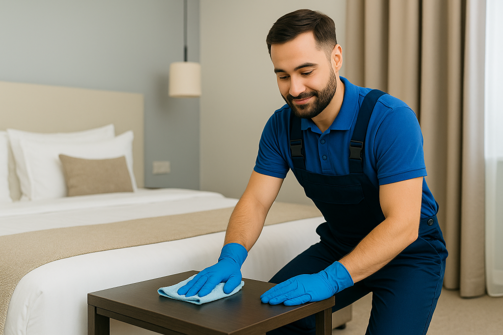 Professionele schoonmaak van hotelkamers, badkamers en algemene ruimtes. Frisse bedden, nette voorzieningen en constante kwaliteit volgens de hoge standaarden van hotels en verblijven.